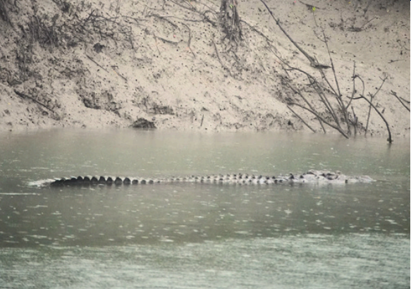 A landscape of mangrove trees in the Sundarbans; a saltwater crocodile, the largest living reptile in the world, also known as the Dragon of the Sundarbans.