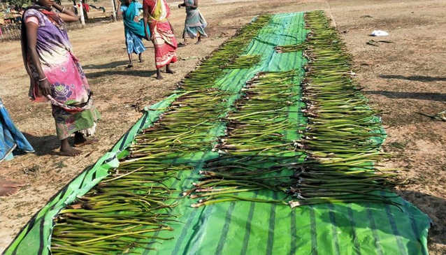Cut stems are sorted and sun-dried by women’s groups, turning an invasive plant into natural-fibre raw material.